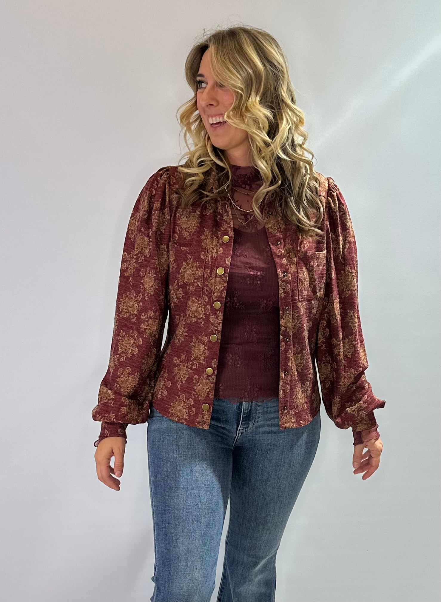 Elevate your everyday style with the Vintage Bloom Snap-Front Knit Top, a gorgeous blend of cozy knit texture and timeless elegance. This burgundy top features an intricate gold floral pattern that brings the perfect touch of holiday shimmer without being over the top. Designed with long puff sleeves, a classic collar, and vintage inspired snap buttons, it delivers that chic, feminine look your customers love.