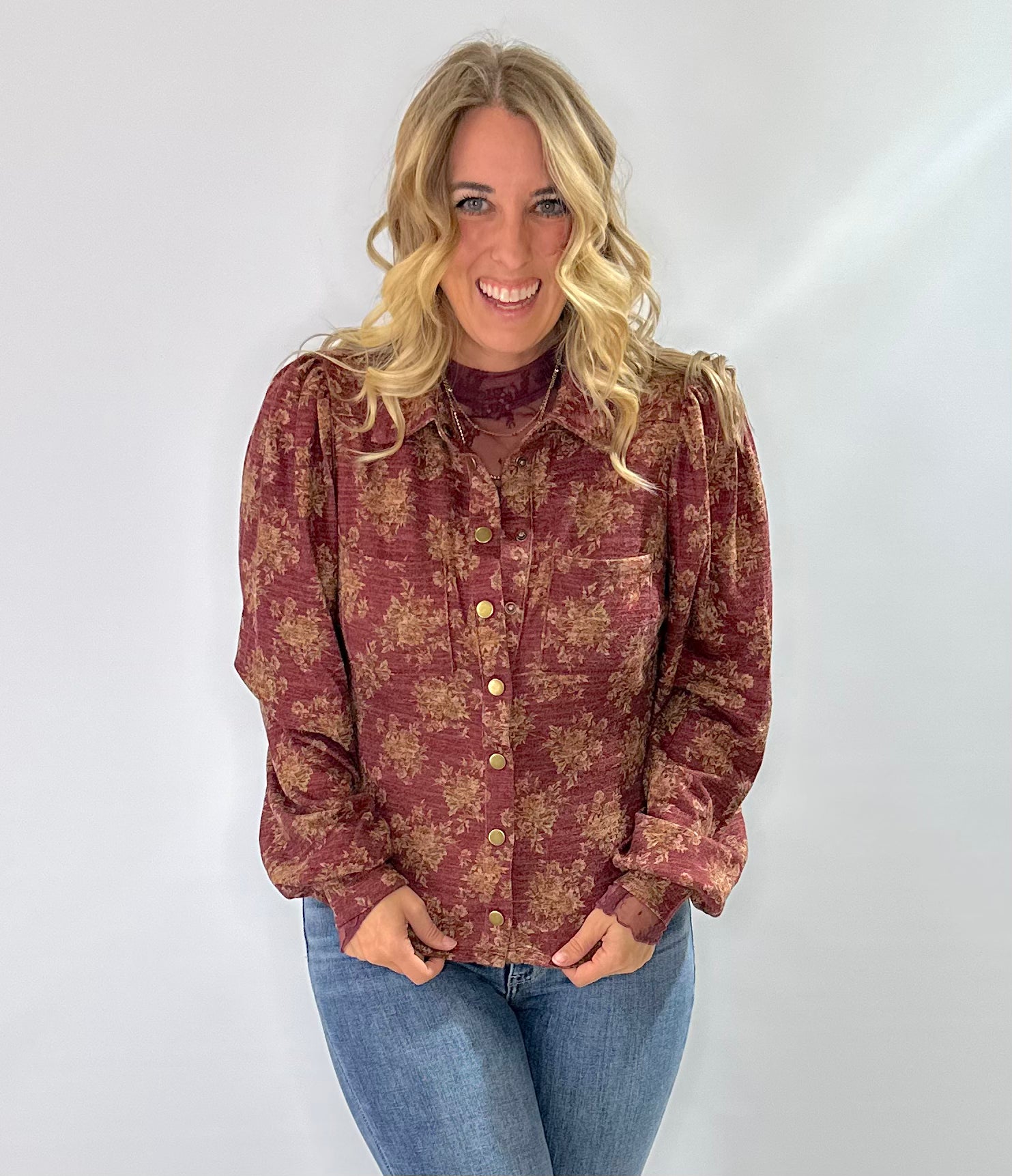 • Elevate your everyday style with the Vintage Bloom Snap-Front Knit Top, a gorgeous blend of cozy knit texture and timeless elegance. This burgundy top features an intricate gold floral pattern that brings the perfect touch of holiday shimmer without being over the top. Designed with long puff sleeves, a classic collar, and vintage inspired snap buttons, it delivers that chic, feminine look your customers love.