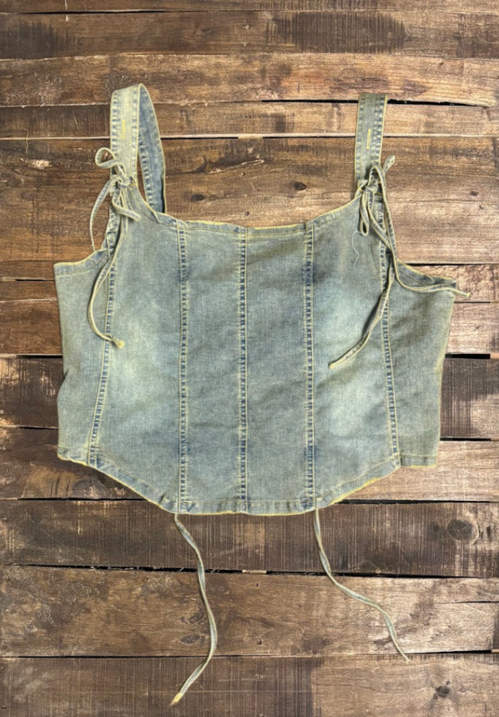 Elevate your free-spirited aesthetic with this premium 100% cotton denim corset tank, featuring an adjustable lace-up back for a perfect, custom fit. This designer-made USA staple blends vintage edge with effortless bohemian charm for a truly high-impact look.