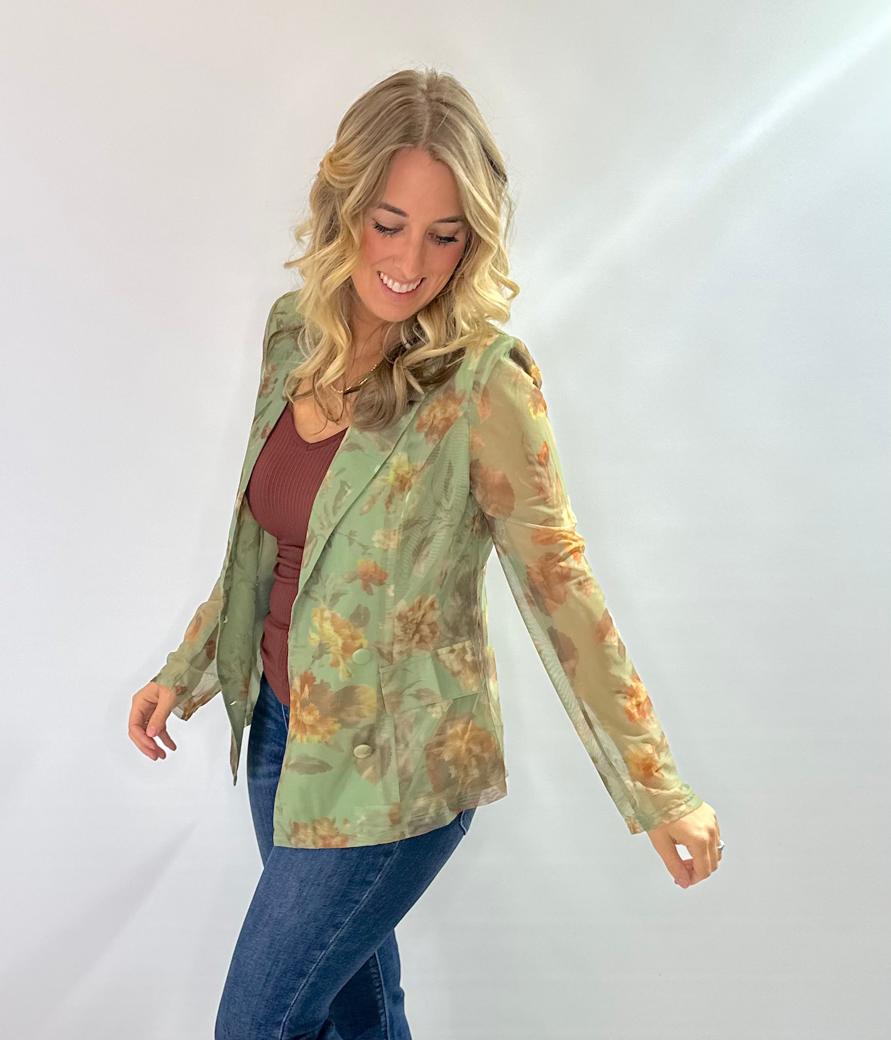 Elevate your wardrobe with the Enchanted Garden Sheer-Sleeve Double Breasted Blazer, a statement piece that blends structure, femininity, and a touch of drama. This fitted blazer features a subtle stretch for a flattering silhouette, while the green floral pattern adds bold, sophisticated charm.