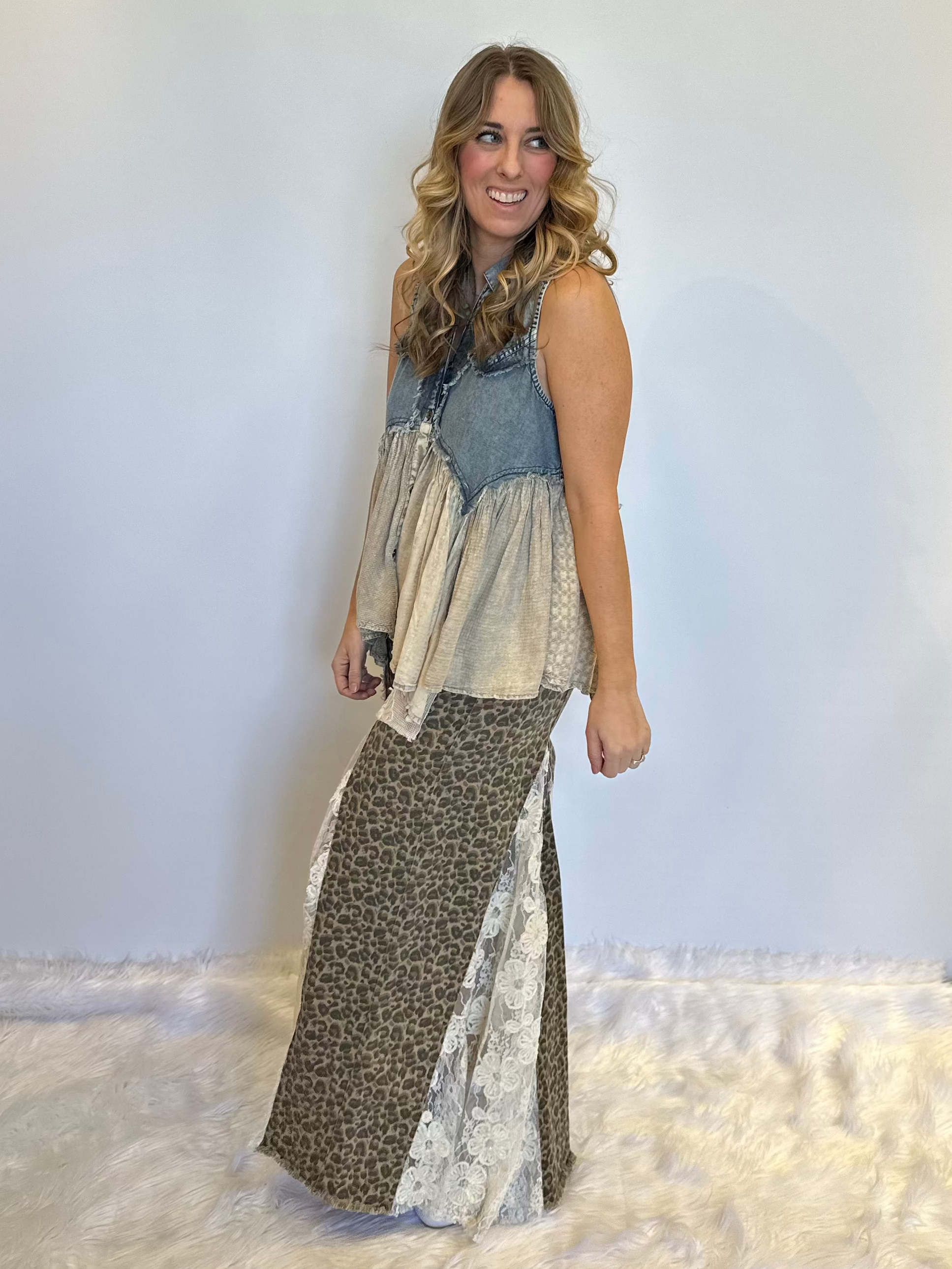 Bold, romantic and unapologetically boho - The Wild Reverie Leopard Lace Ruffle Wide Leg Pants are made to turn heads. Designed in a soft taupe-grey leopard print, these full length statement pants feature an exaggerated wide-leg silhouette with mixed lace and ruffle detailing for dramatic movement and texture. The elastic waistband offers all-day comfort, while center side pockets add a practical touch. Pair them with a simple tee or flowy blouse and let the pants do all the talking.