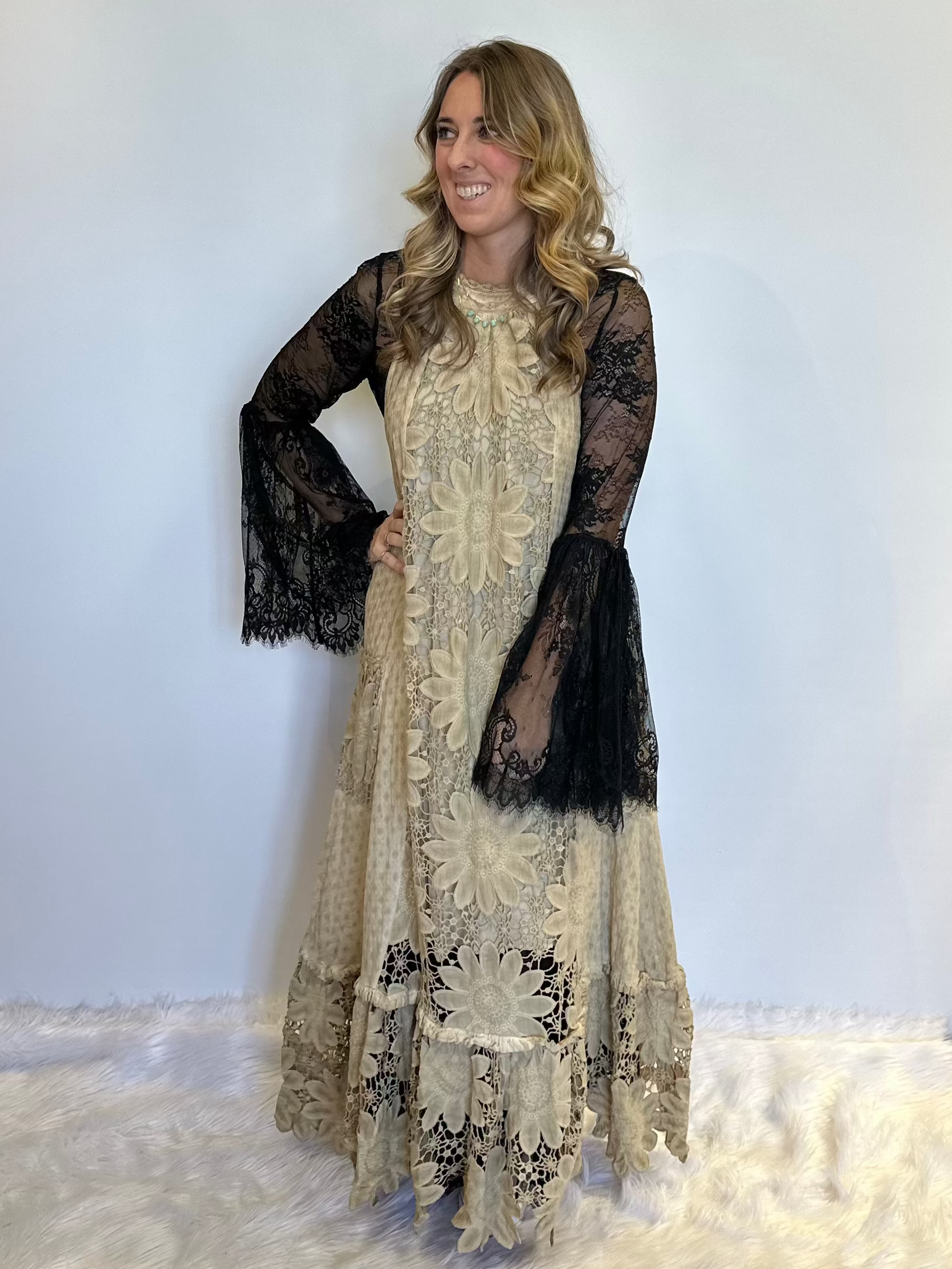 Jaded Gypsy dress, boho crochet maxi, vintage tea stain dress, festival fashion, bohemian cotton dress, daisy crochet clothing, relaxed fit maxi, western boho style.