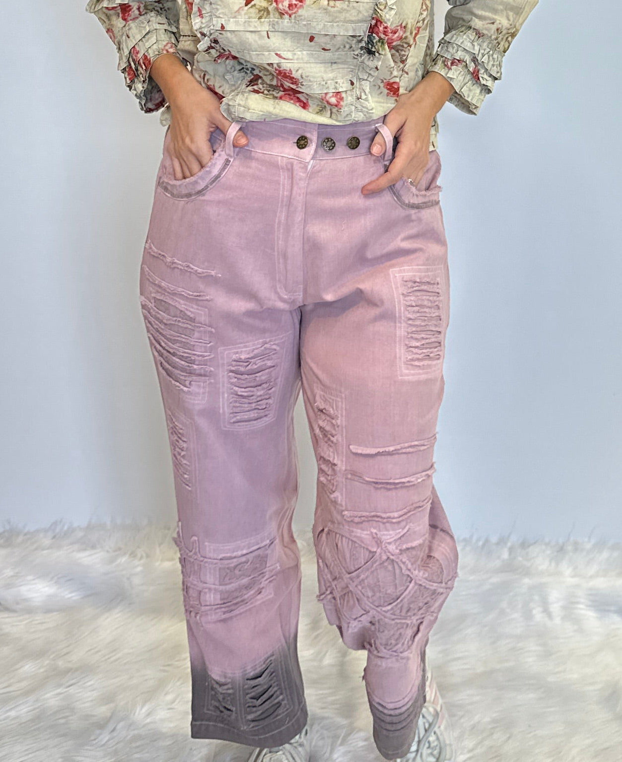 • Experience artisanal luxury with these handcrafted lilac denim pants featuring a striking brown shade spray and delicate lace accents. Crafted from 100% premium cotton with a flexible elastic back waist, these designer boho trousers blend effortless comfort with high-end, statement style.