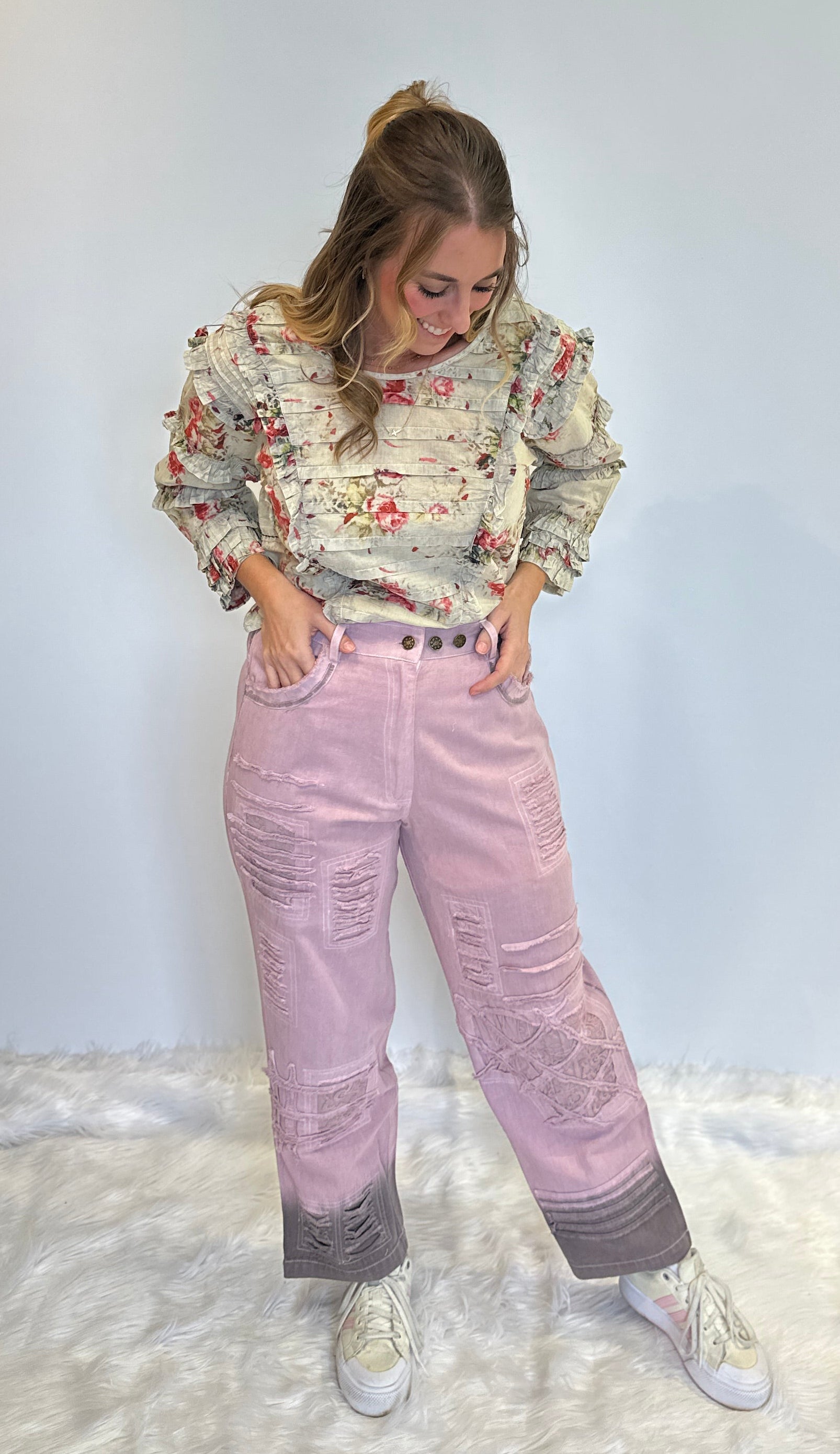 Shop our handcrafted Lilac Boho Denim Pants. Featuring lace accents, 100% cotton, and a unique brown spray hem. Perfect for effortless, designer style!