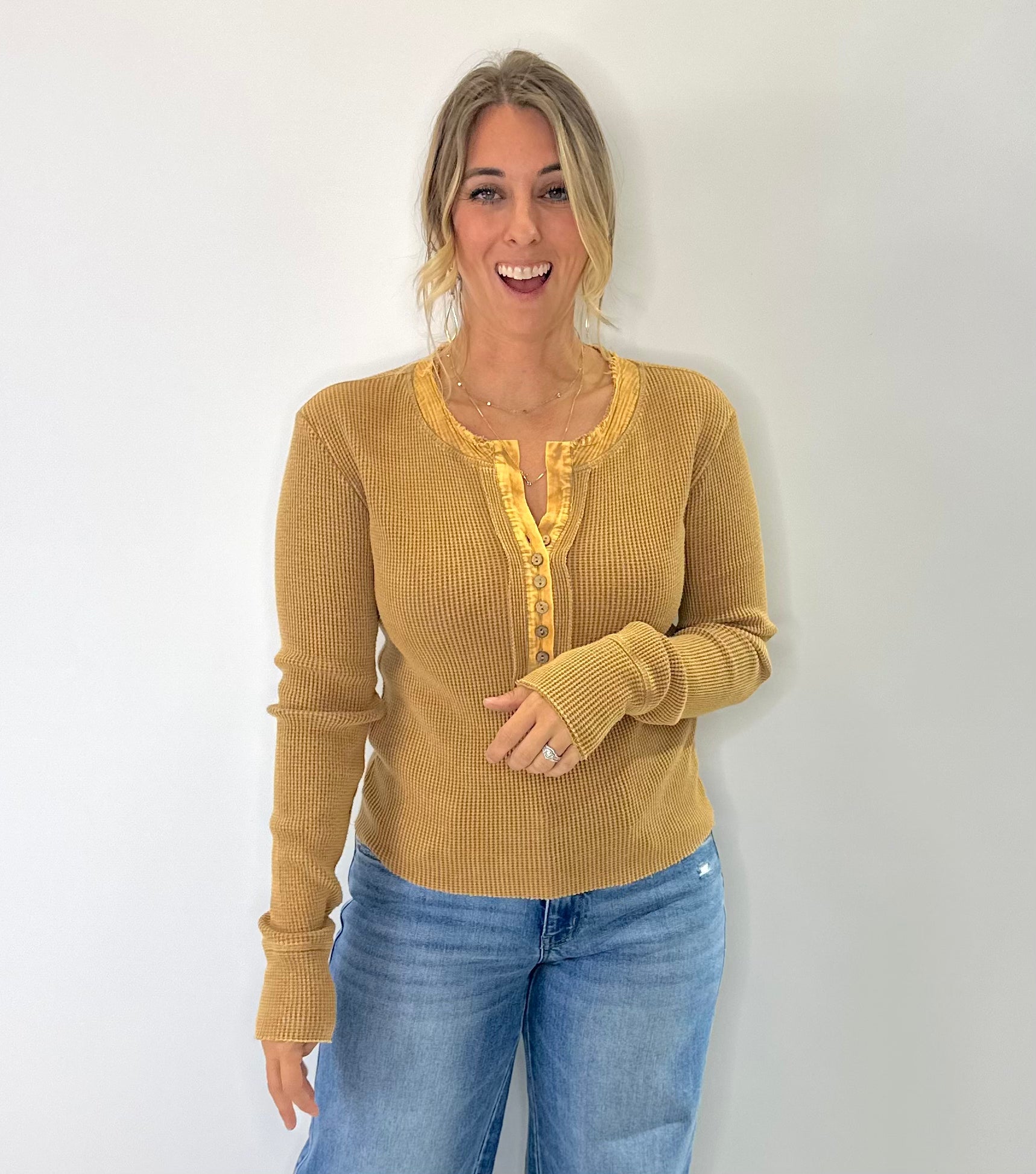 Stay Warm in effortless style with the Golden Brew Thermal Top. This elevated basic blends cozy comfort with refined detail - featuring a soft waffle textured knit, button front neckline, and fitted sleeves with thumb holes for that extra cozy touch. The rich coffee-yellow hue brings a warm glow to cool weather looks, making it easy to pair with denim, leggings or layered under jackets and shackets. Whether lounging at home or headed out for a coffee run, this thermal is the perfect mix of comfort and sophistication.