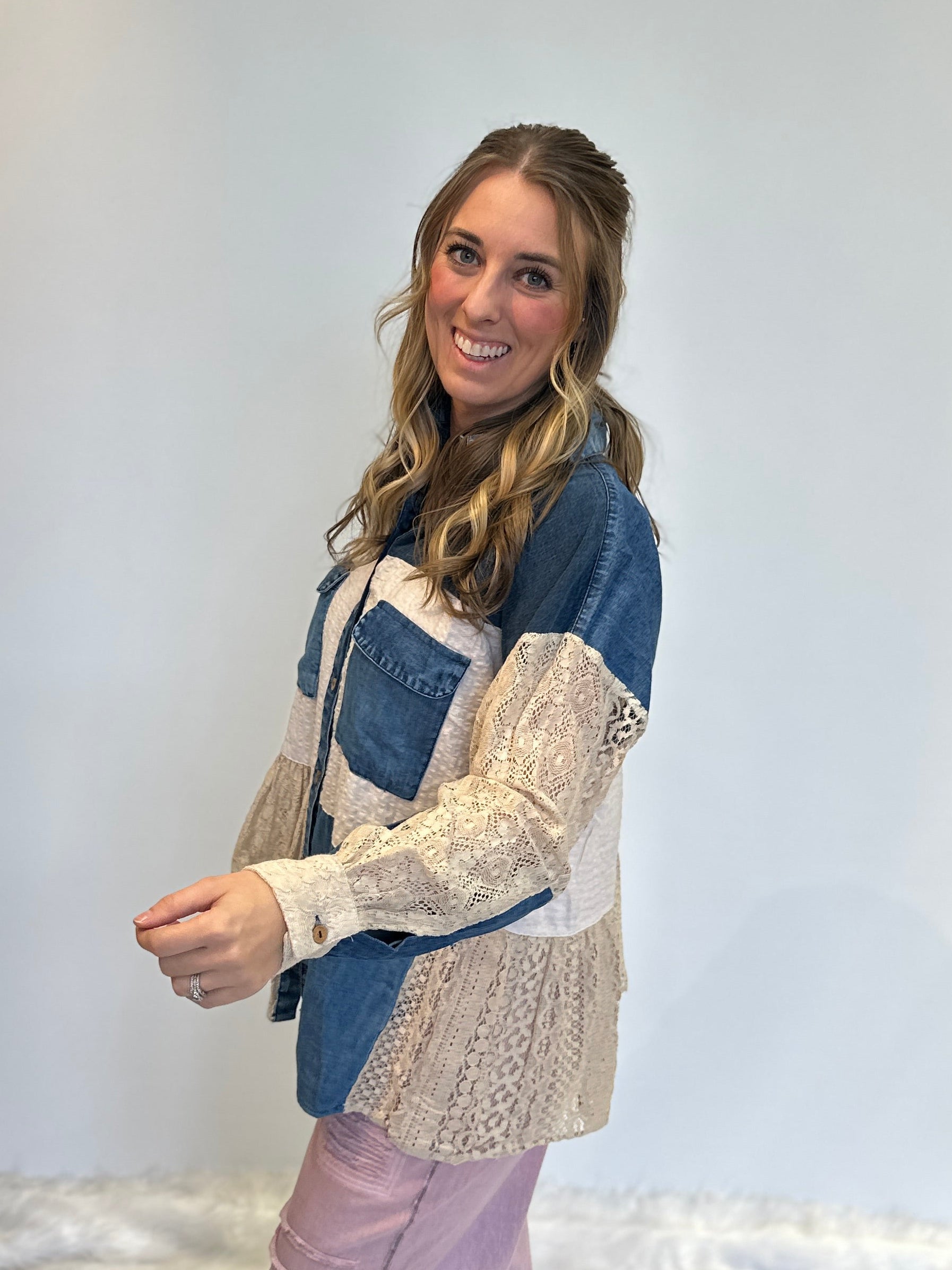Shop the Prairie Spell Mixed Media Denim Shirt. Featuring lace patchwork and a relaxed fit, this lightweight shacket is the ultimate boho-chic layer. Order now!