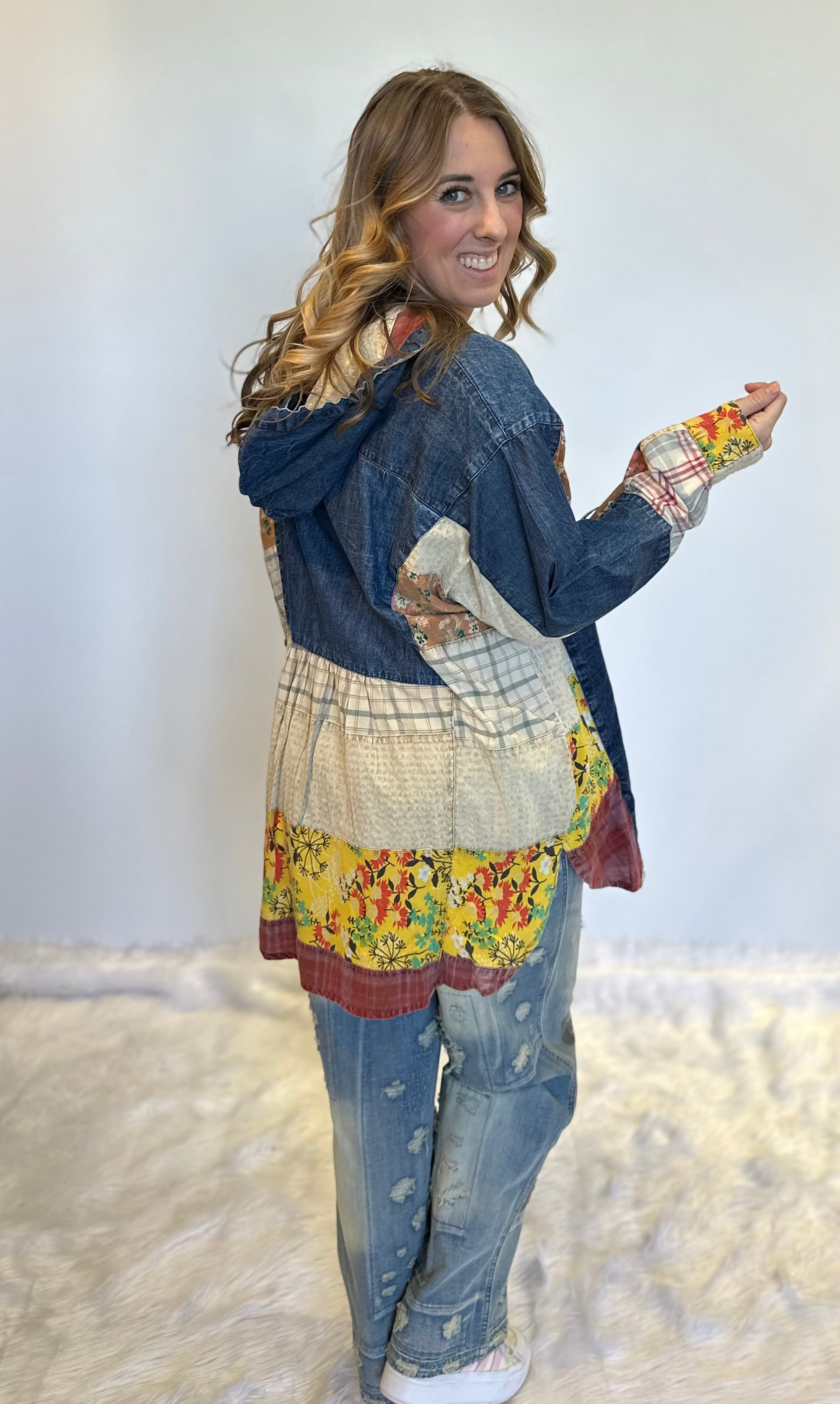 • Meet the top that blends denim cool with free-spirited charm. The Wanderfolk Patchwork Denim Hooded Top is an oversized, throw on and go layer designed for comfort, creativity and effortless boho style.