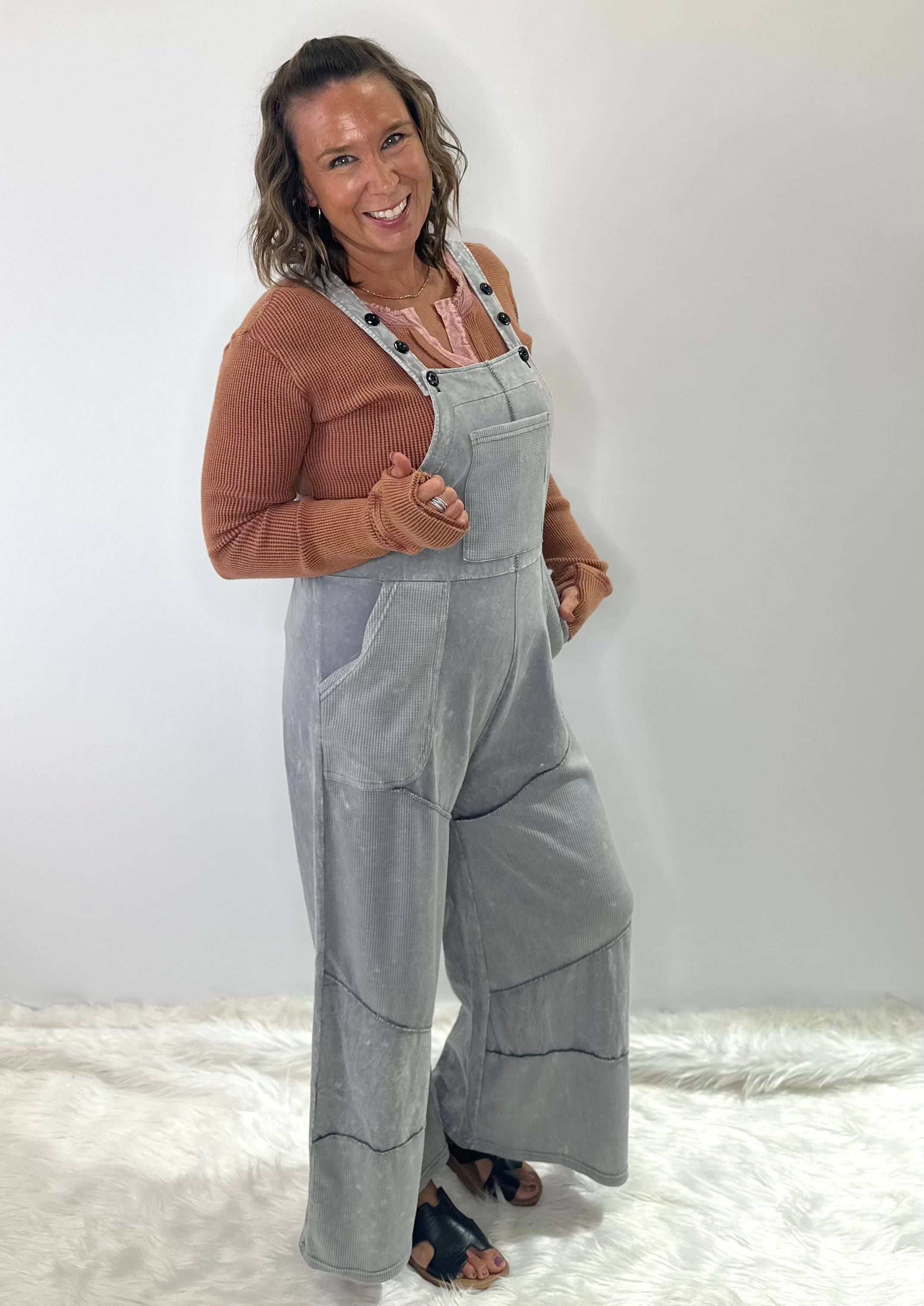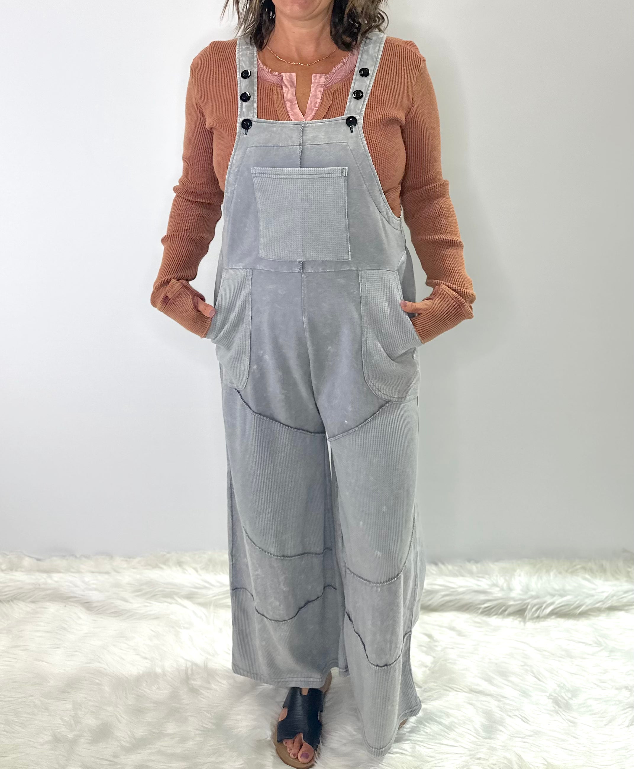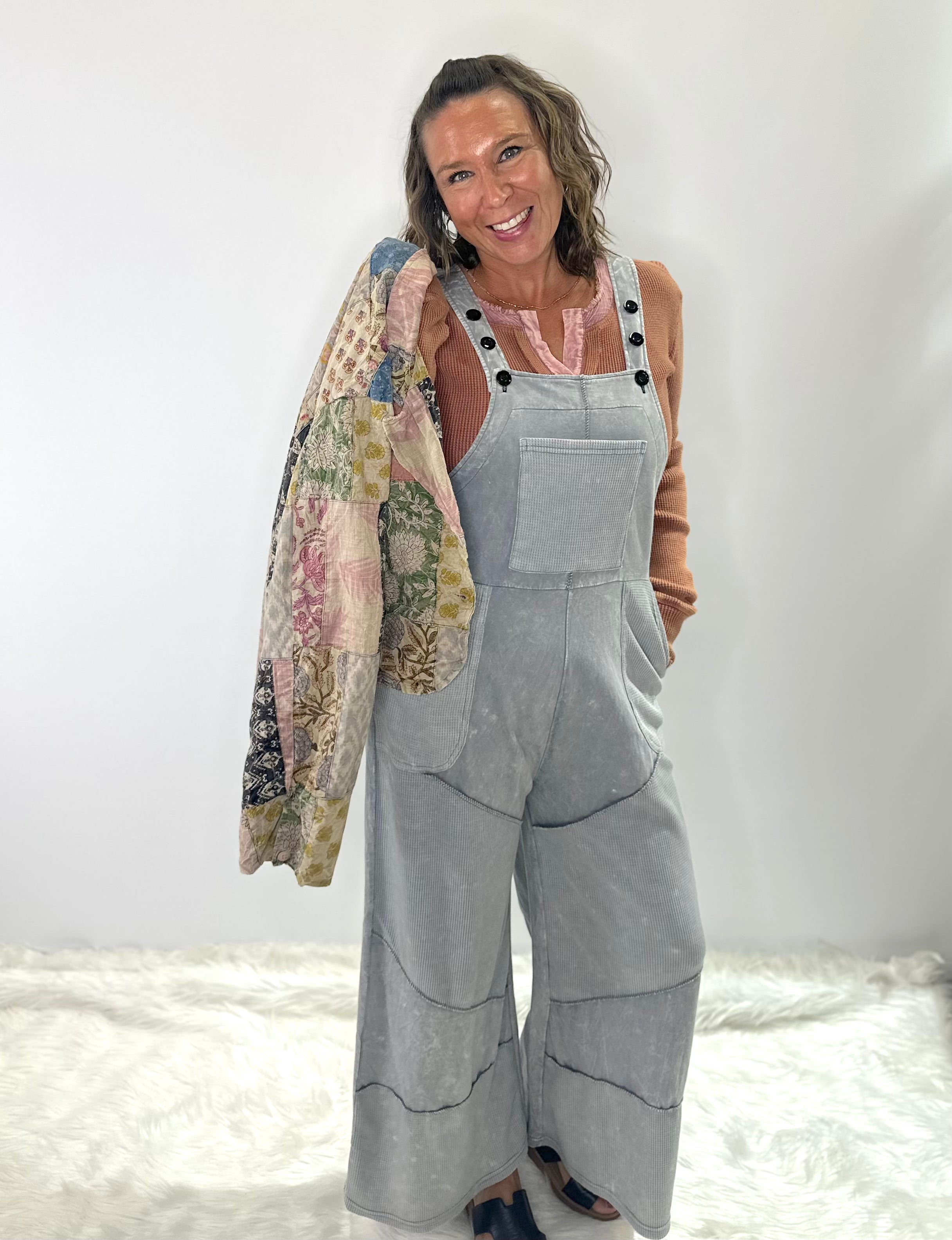 Step into effortless boho comfort with the Free Spirit Patchwork Jumpsuit with Waffle and Grey French Terry. Designed with a relaxed overall silhouette, this jumpsuit combines cozy waffle-knit texture with soft French Terry for all-day ease. Unique patchwork details bring artisanal charm and a one of a kind feel, while the adjustable straps and roomy fit make it perfect for layering over your favorite tees, tanks, or lightweight sweaters. Whether you're lounging at home, exploring the market or styling it up with boots and a jacket, this jumpsuit captures that carefree free-spirited vibe in every stitch.