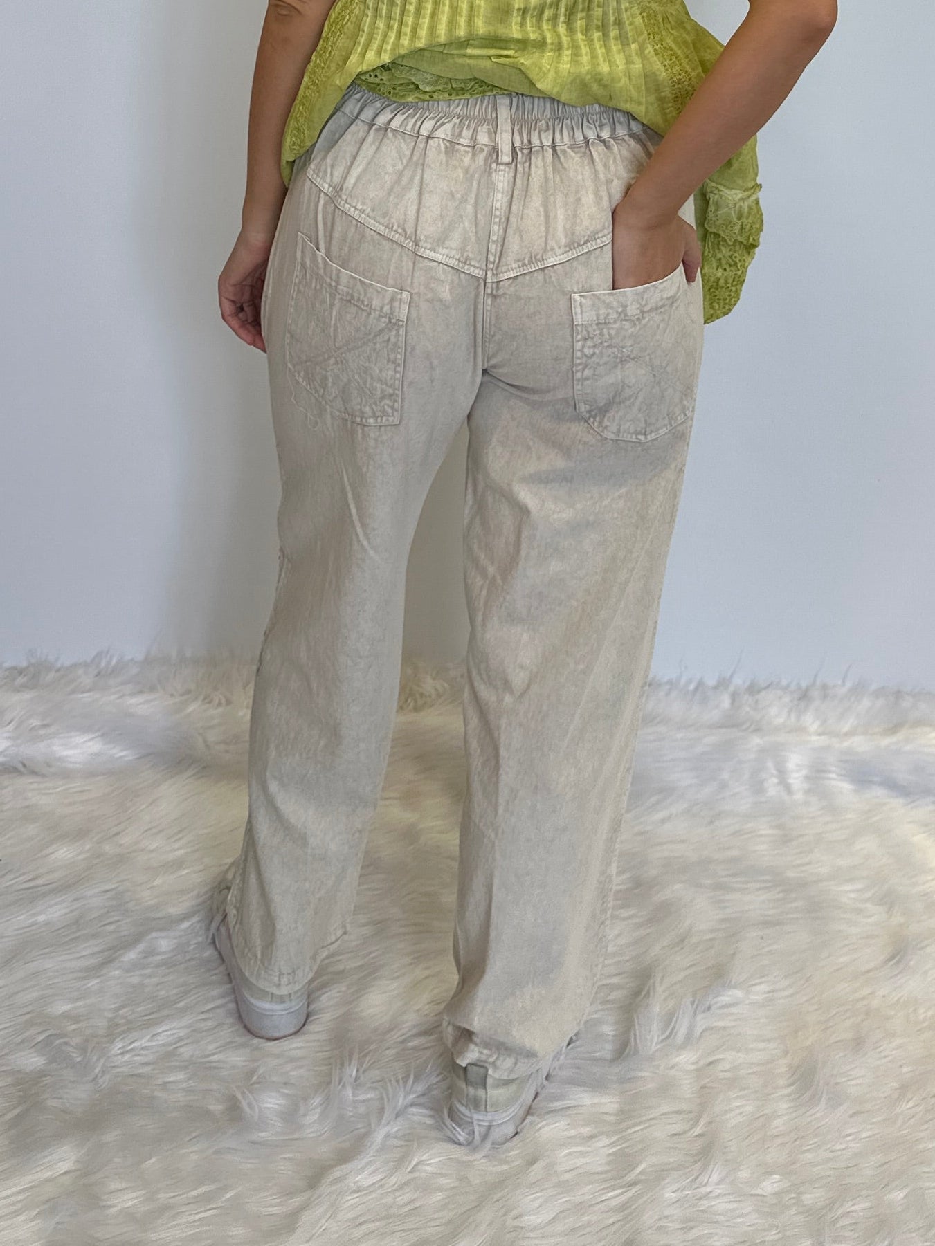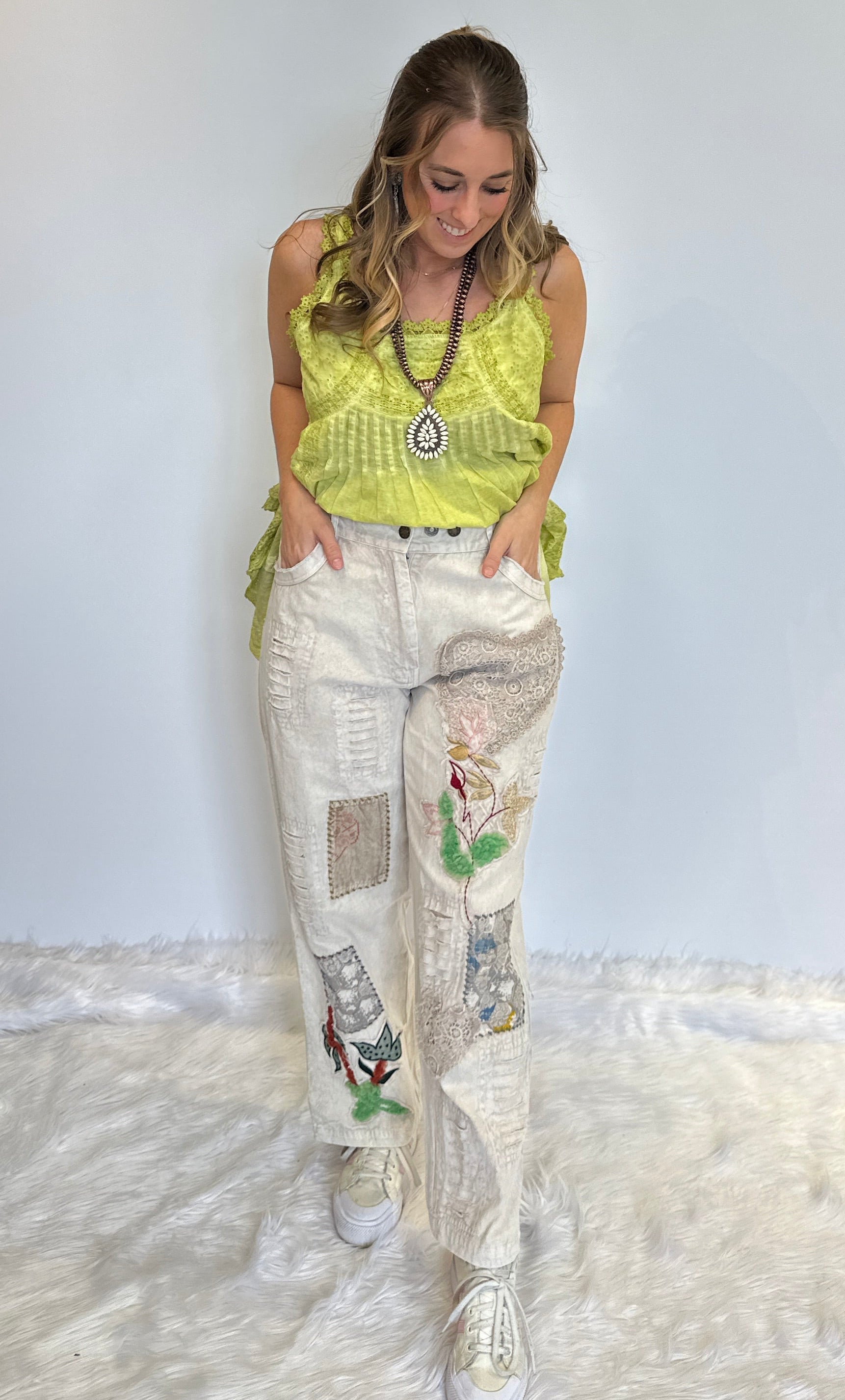 Boho Lace Heart Embroidered Cotton Pants – Cream Patchwork Trousers