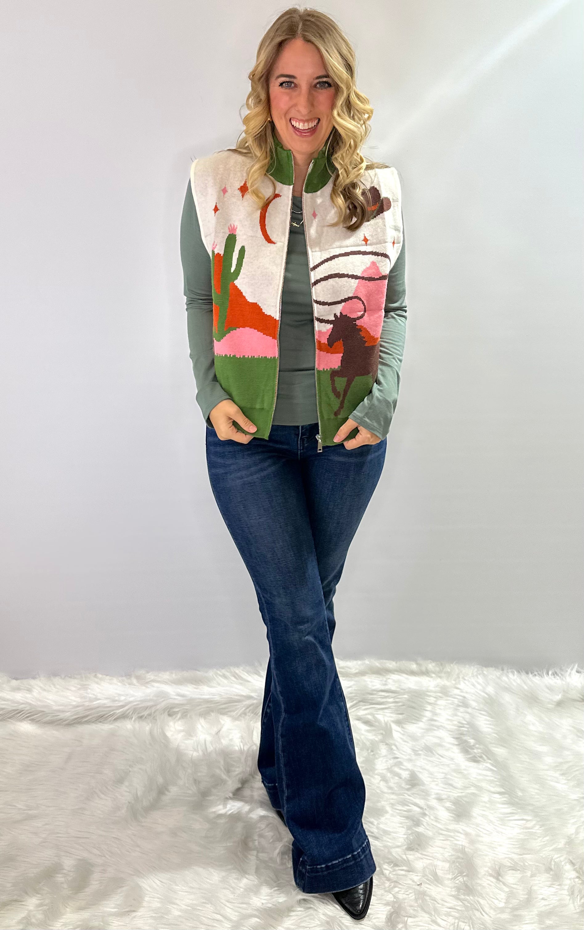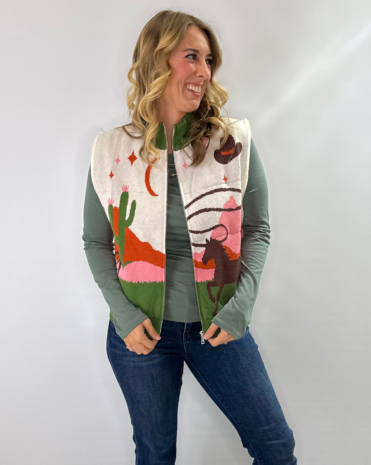 Cozy western vibes meet everyday versatility in the Sage Canyon Zip-Up Sweater Vest. This sleeveless high-neck vest features a soft knit body with a bold western pattern in shades of green, cream, rust, and blush pink - making it the perfect statement layer for transitional seasons.