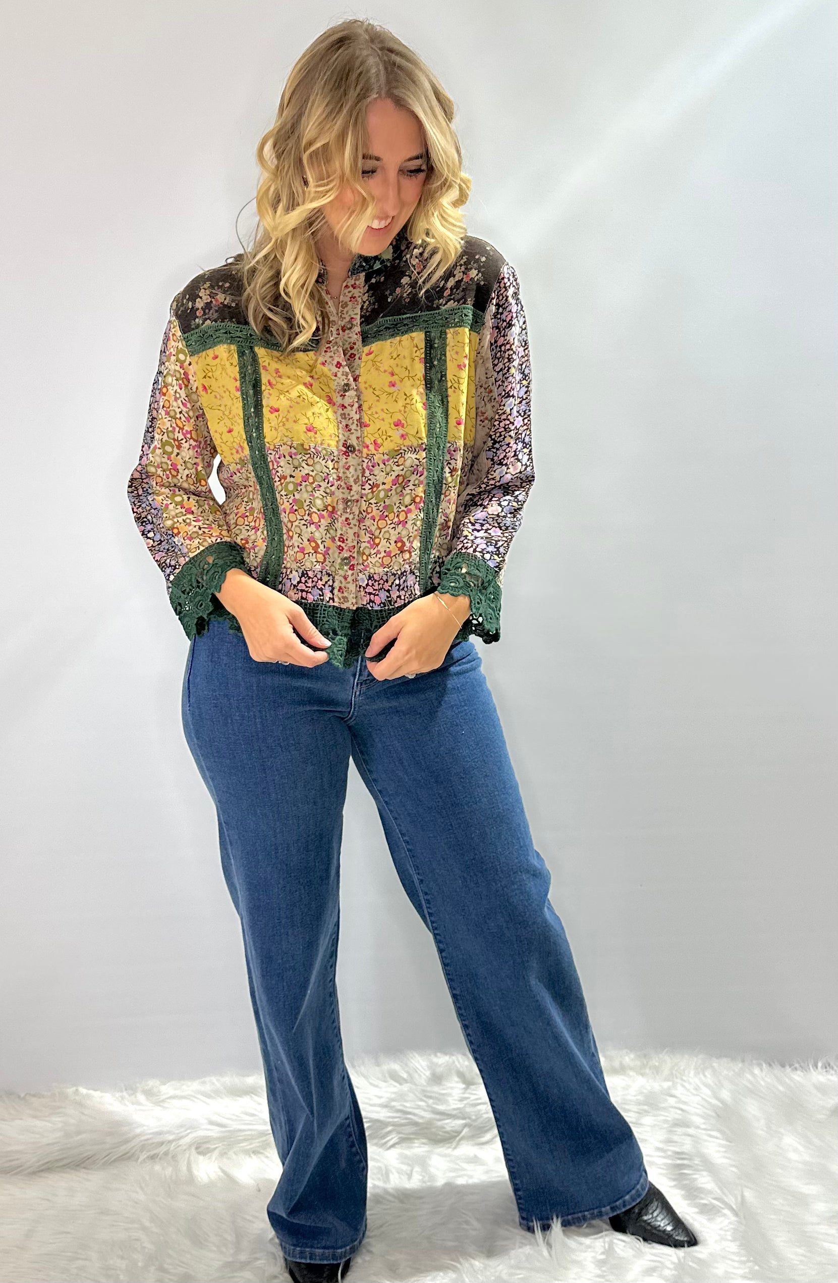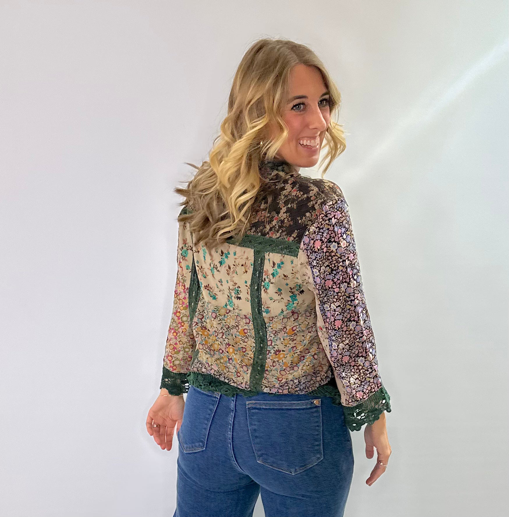 Meet the Sunset Stitch Patchwork Cropped Top - a true bohemian beauty crafted with eclectic mixed-fabric patchwork and intricate crochet detailing. This button-down cropped silhouette brings effortless charm with its relaxed fit, front closure, and artisan inspired design.