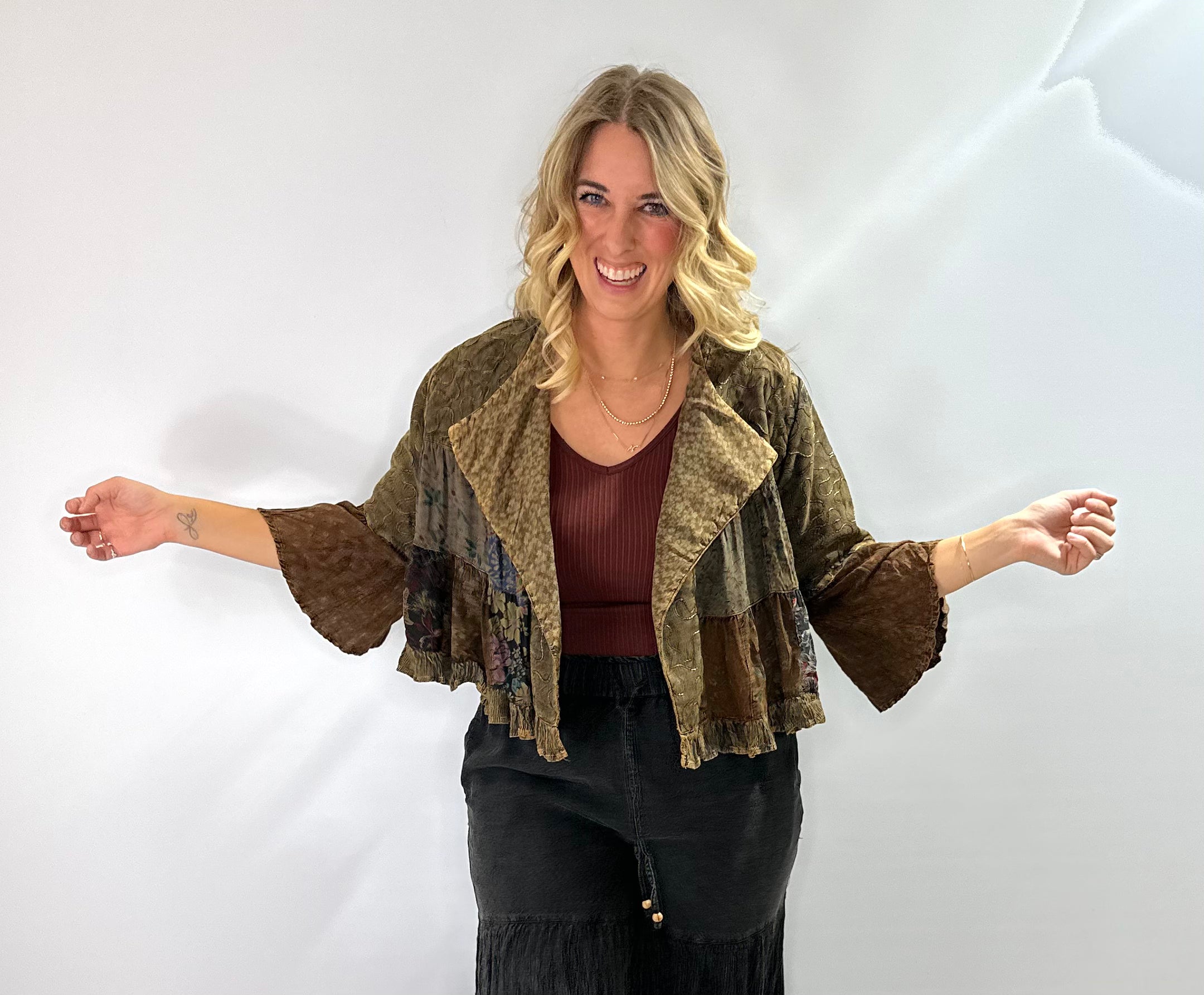 Designed with a soft lapel collar and relaxed 3/4 sleeves, it's the perfect statement layer over basics, dresses or denim. The warm brown palette and deep seasonal hues tie every outfit together with effortless western-boho charm.