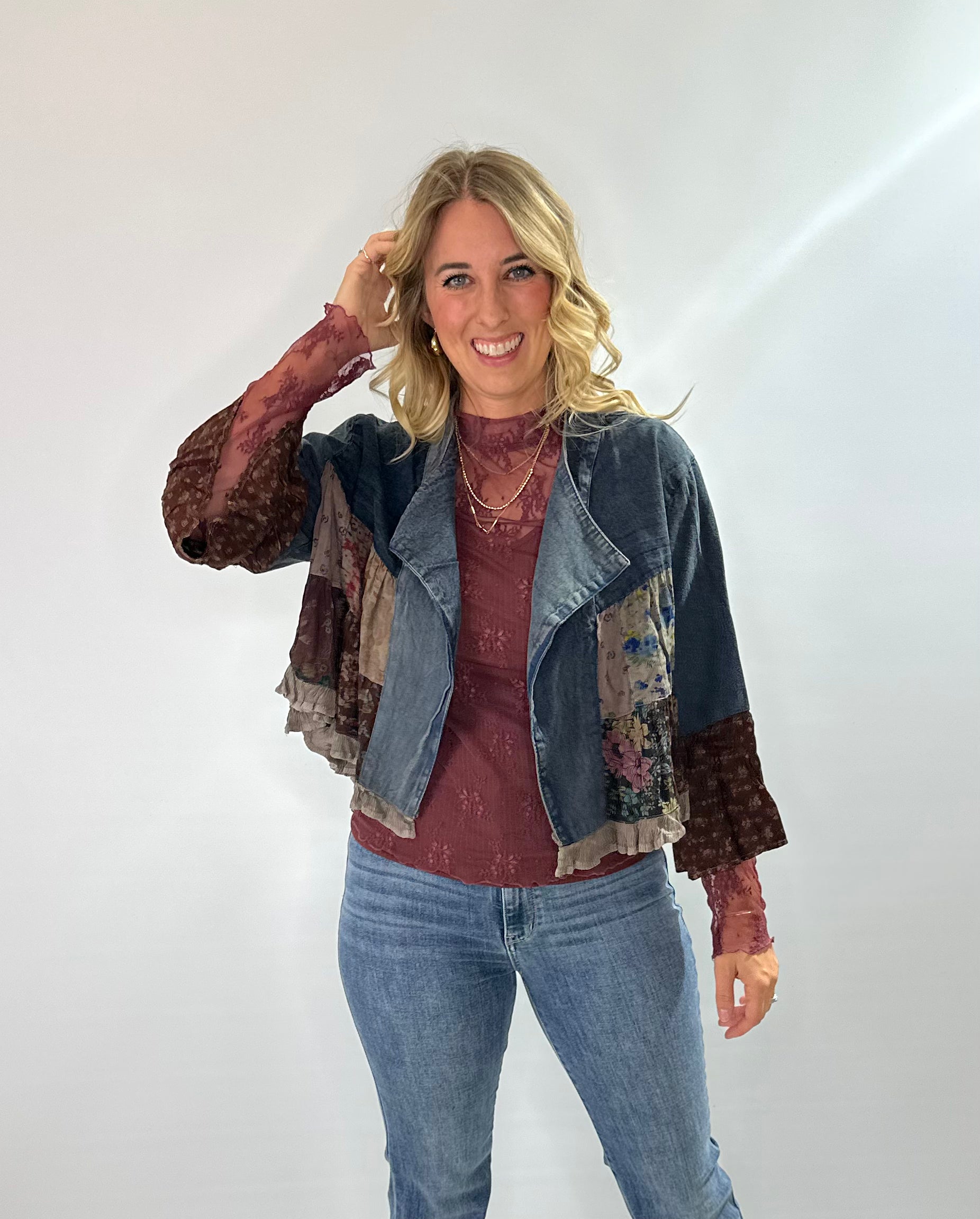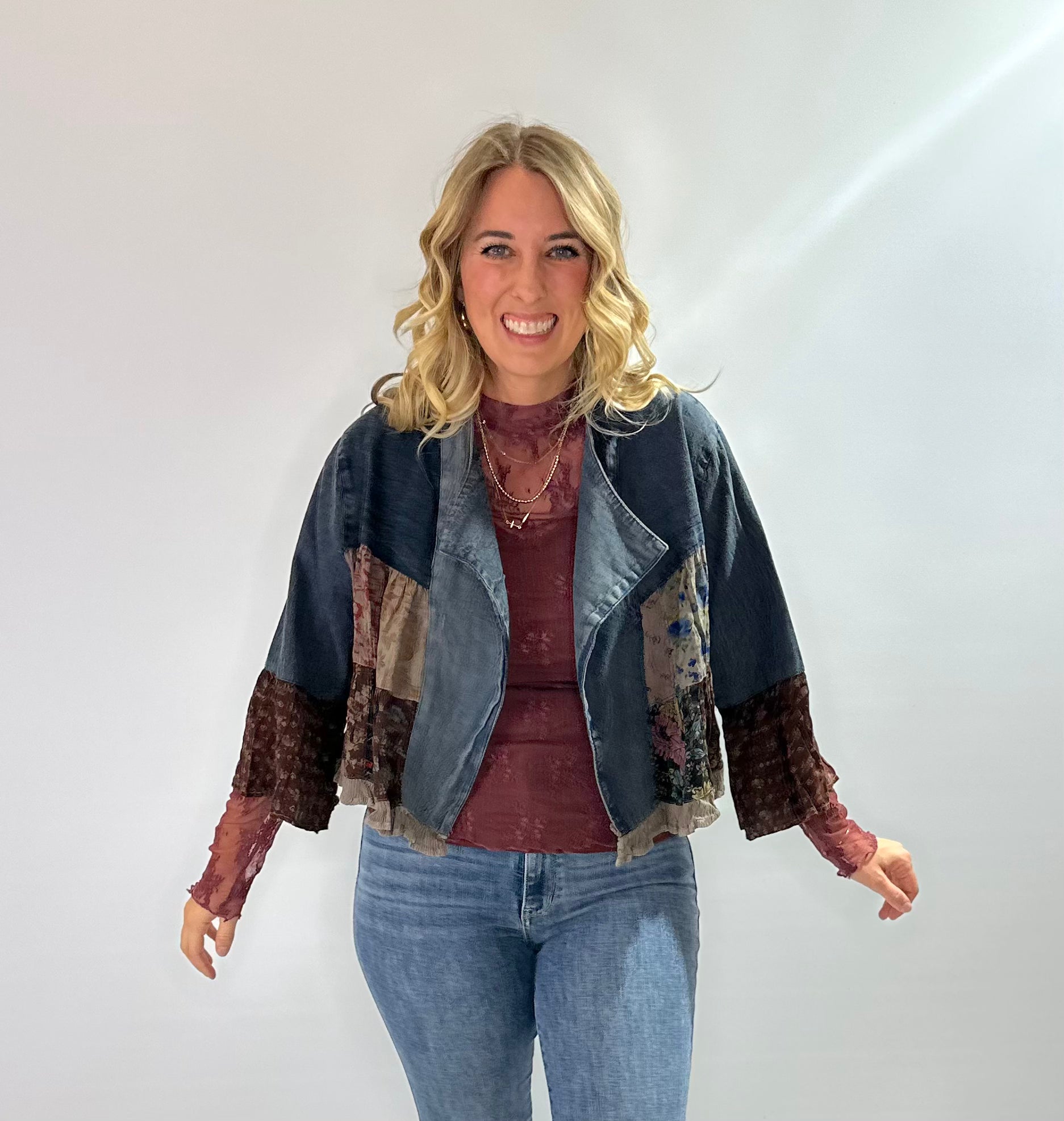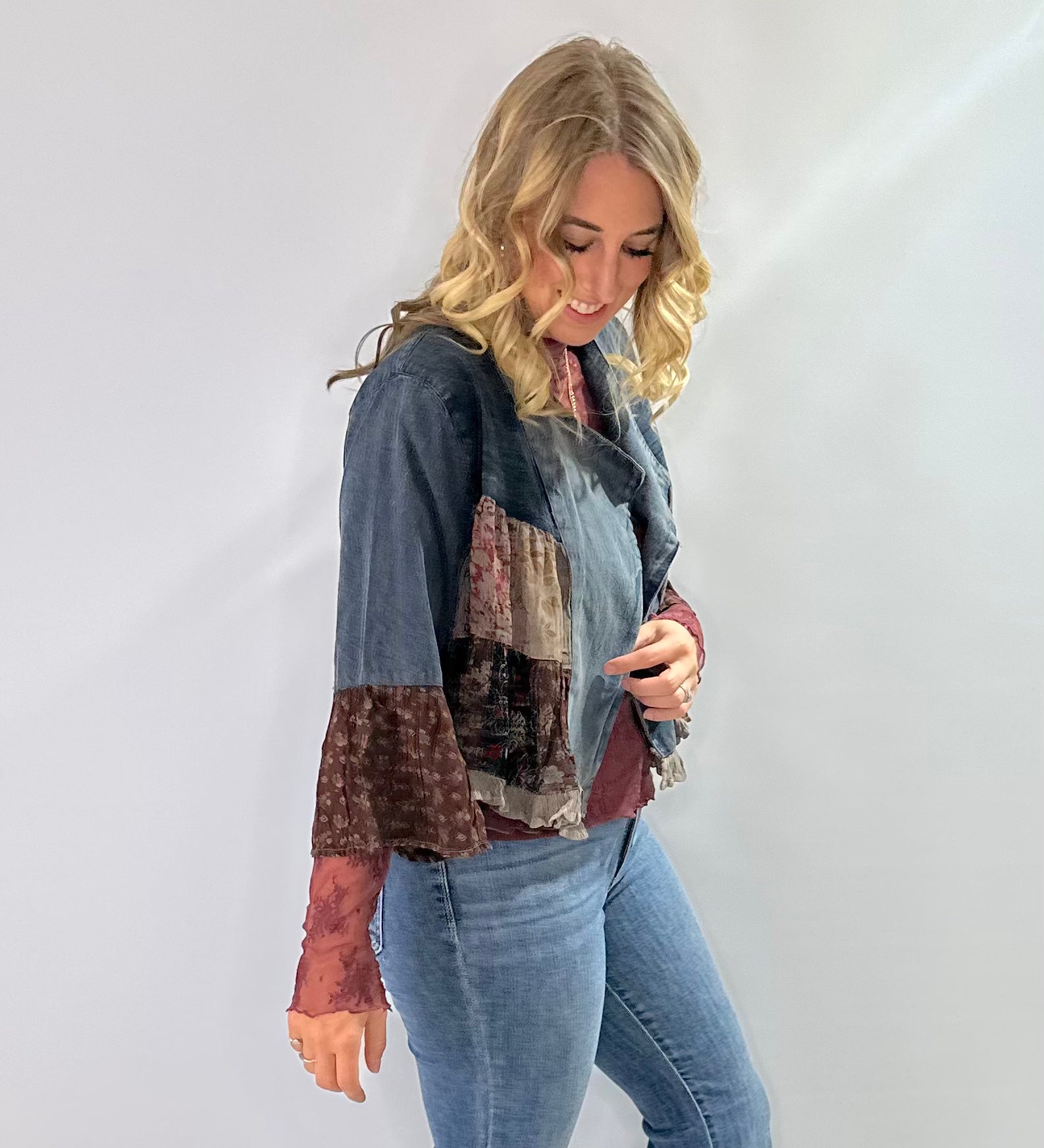 A soft lapel collar and relaxed 3/4 sleeves give it an easy, effortless fit, making it the perfect statement topper for dresses, basics, or western-chic outfits. The denim and wine color palette delivers a beautiful contrast that transitions seamlessly from season to season.