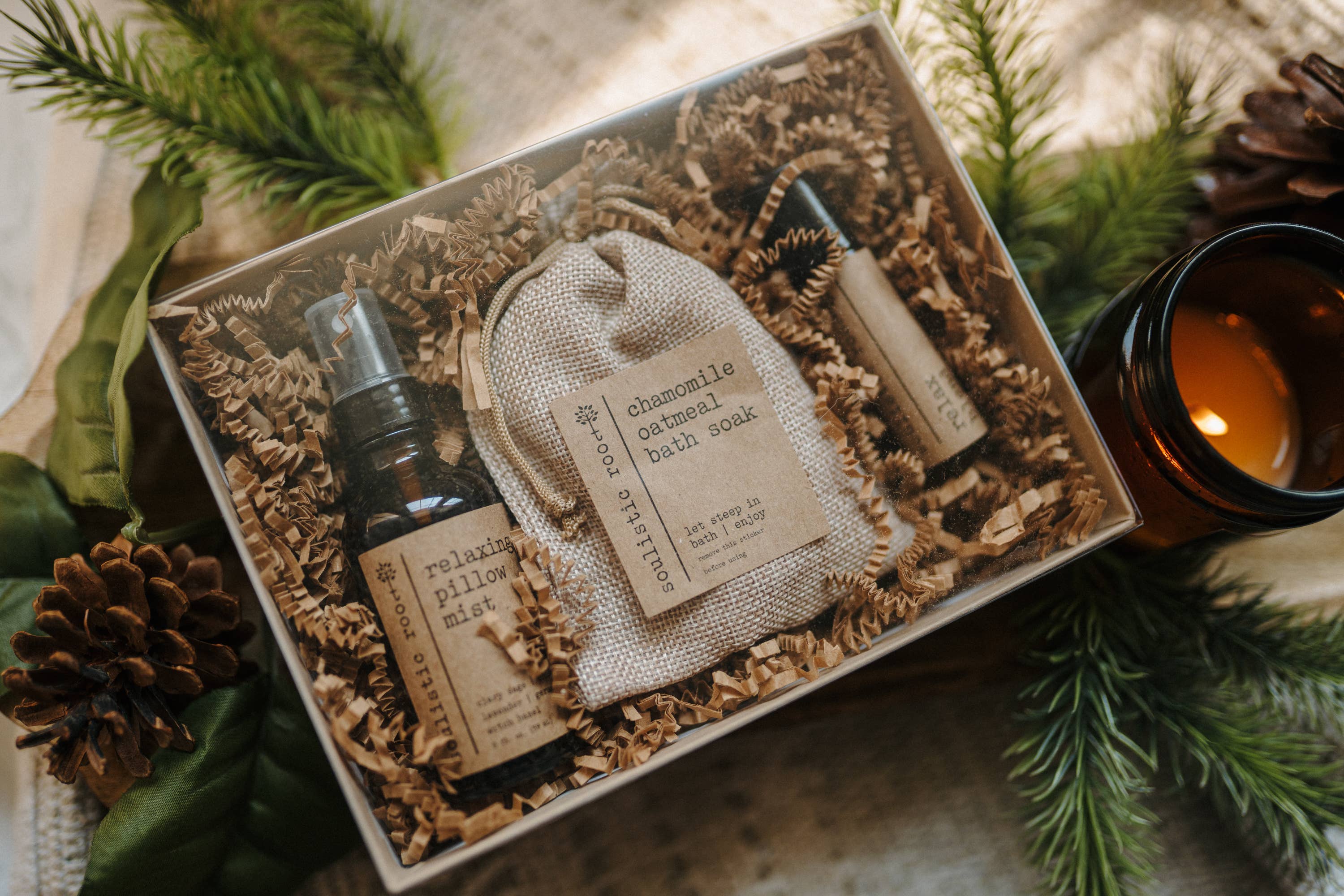 This festive gift box features a calming collection of customer favorites designed to relax the mind and body during the busy holiday season. Packaged in a kraft box with natural crinkle paper, a clear display window, and finished with a black tie closure. Gift-ready, and a customer favorite for Christmas gifting.