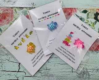 • Use "turtle power" to tell people how awesome they are! These are sweet little positivity turtles to throw in bags as thank you's. The card backing comes in three different designs.  All the cards say the same sentiment, but the cute designs vary. And.... the little turtles glow in the dark!