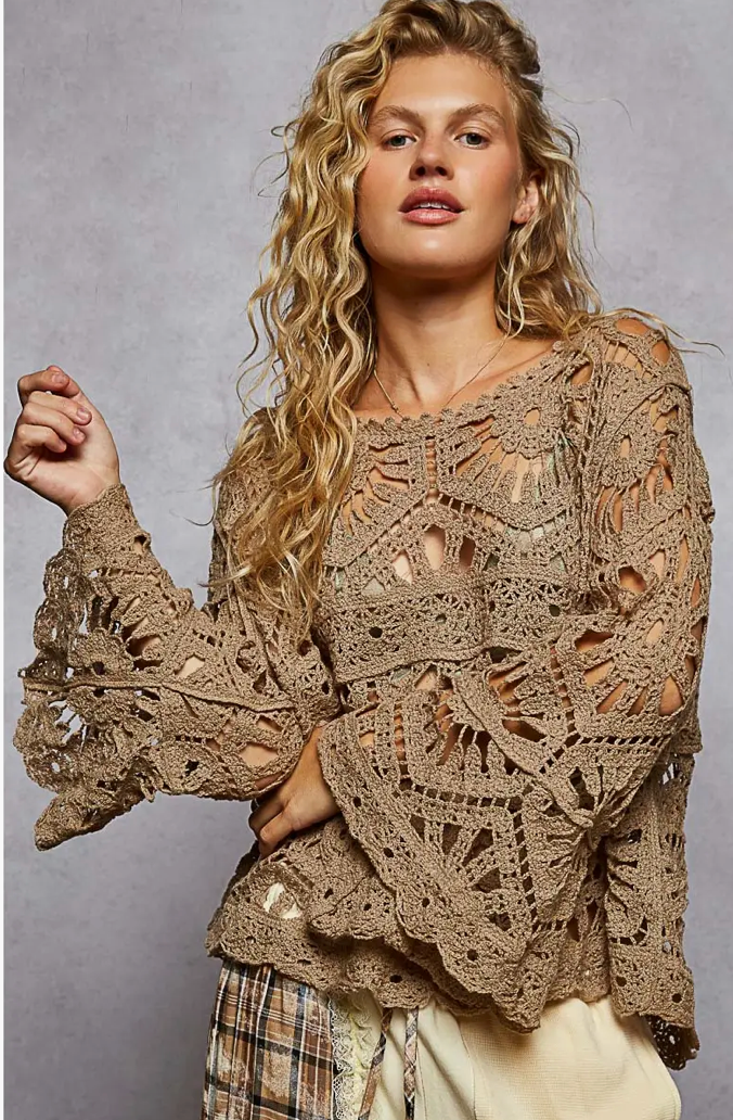 The intricate open-weave crochet gives it that airy, handcrafted texture customers love, while the soft stretch keeps it comfortable for all-day wear. Whether styled casual or dressed up, this top adds a romantic, artisan touch to your look.