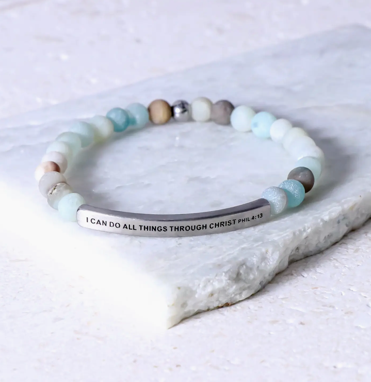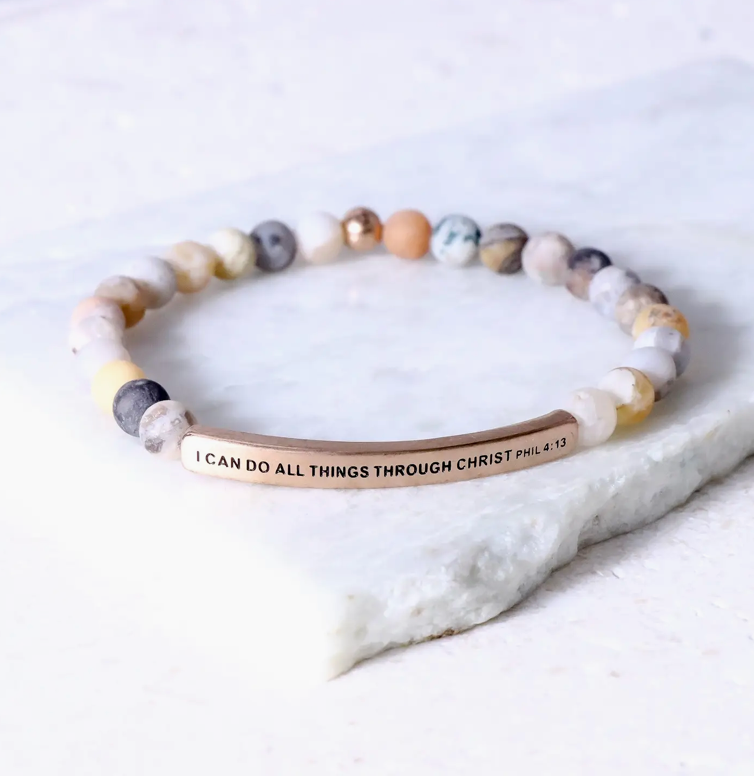 I CAN DO ALL THINGS THROUGH CHRIST. Cause and effect… What does that mean? In the physical world, electricity is the cause and a hairdryer is the effect. Electricity is the power that causes a light bulb to glow and to become the effect of that power. In the spiritual world, God is the cause and a thunderstorm is the effect. God is the power that causes a baby to be born as an effect of that power. God’s power is just as mysterious to us as electrical power. The good news is that we don’t have to understand it, to use it. We don’t have to understand the infrastructure of a nuclear power plant in order to press the button to watch TV. Likewise, we don’t have to earn a PHD in theology to witness and observe God’s power flowing through us, as a current of electrical spiritual power. Electricity is generated by the controlled flow of water through a dam. God’s energy is generated through us by the controlled flow of thoughts in our mind and the words spoken from our mouth. We are not the cause. We are the effect. We are not the power. We are the demonstration of God’s power. May this bracelet remind you that WE CAN DO ALL THINGS THROUGH CHRIST who flows through us with a spiritual current of power, passion and potential.